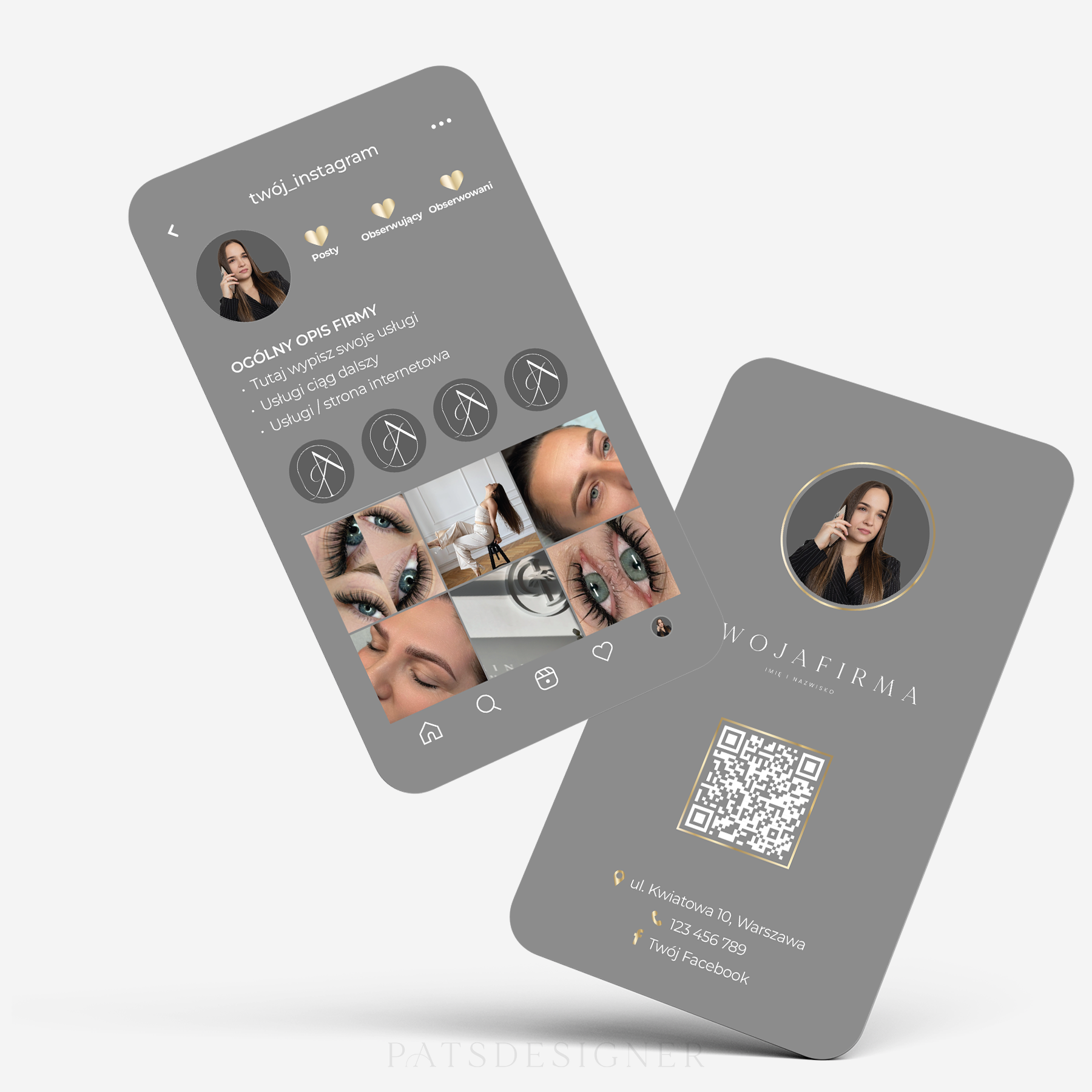 Gotowy projekt do personalizacji Twoim logo, danymi firmy, kodem QR i zdjęciami.